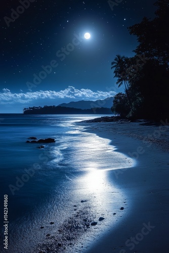 night, ocean, beach, moon, star, sky, cloud, palm, tree, sand, water, wave, shore, rock, serenity, calmness, calm, peaceful, dark, blue, tropical, island, moonlight, coastal, nature, landscape, scenic, view, silhouette, darkness