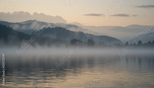 Serene Morning Landscape with Mist Over Calm Water and Mountains