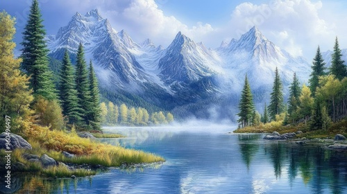 mountain, lake, nature, tree, sky, water, forest, landscape, blue, green, peaceful, tranquil, serenity, calm, beautiful, scenic, pine, evergreen, snow, peak, summit, alpine, wilderness, outdoors, horizon, cloud, mist, fog, dawn, sunrise, morning, majestic, grand, imposing, idylli, picturesque, natural, scenery, art, painting, artwork, digital, illustration