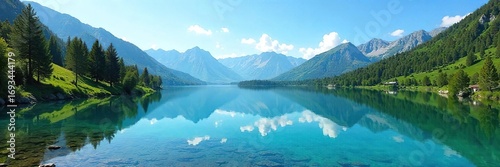 Serene mountain lake reflecting a clear blue sky, untouched nature perfect for mindfulness and meditation Find inner peace amidst the tranquil landscape , green, landscape
