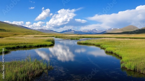 Serene mountain lake reflecting clouds and snow-capped peaks under a vibrant blue sky, surrounded by lush green grasses and reeds. : Generative AI