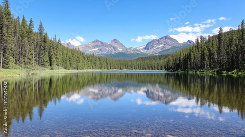 Serene mountain lake reflecting majestic peaks under a vibrant blue sky, surrounded by lush evergreen forest. : Generative AI