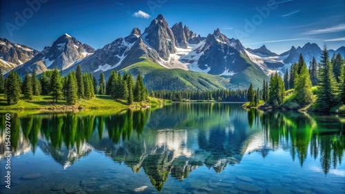 Serene mountain lake reflecting majestic snow-capped peaks and lush evergreen trees under a vibrant sky