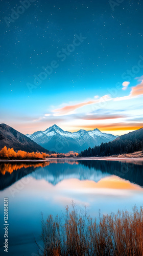 Serene mountain lake sunrise reflection, starry night sky; peaceful nature scene for travel brochures