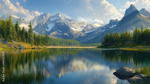 lake, mountain, water, sky, blue, green, forest, tree, cloud, sun, light, nature, scenic, landscape, peaceful, calm, tranquil, serene, picturesque, wilderness, outdoors, wild, beautiful, majestic, awe, wonder, summer, sunny, day, horizon, huge, distant, foreground, background, edge, shore, rock, grass