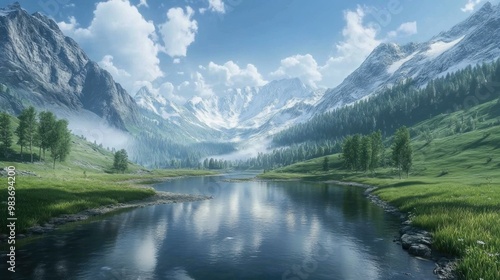 blue, nature, morning, calm, hill, horizon, green, sky, outdoors, landscape, forest, view, artwork, panorama, travel, light, mountain, vale, clean, tranquil, summit, bright, photo, wild, summer, lake, illustration, digital, scenic, adventure, field, peak, natural, art, water, beautiful, alpine, peaceful, grass, serene, cloud, fresh, tree, picturesque, snow, daytime