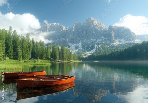Serene Mountain Lake with Wooden Boats and Majestic Peaks Reflecting in Calm Water Under Clear Blue Sky in Early Morning Light