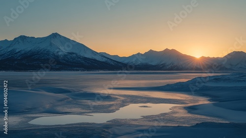 Serene mountain landscape at sunset, reflecting on the icy water below.