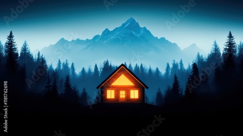 Serene Mountain Landscape with Cozy Cabin and Warm Light Glow