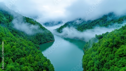 Serene Mountain Landscape With Misty River and Lush Green Forests