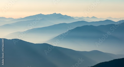 Serene mountain layers landscape in shades of blue at sunrise, a tranquil photo.