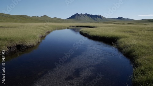 Serene mountain stream winding through grassy plains