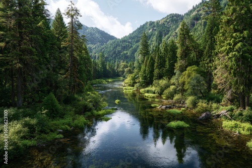 Serene mountain valley river flowing through lush green forest with verdant trees and reflective water surface