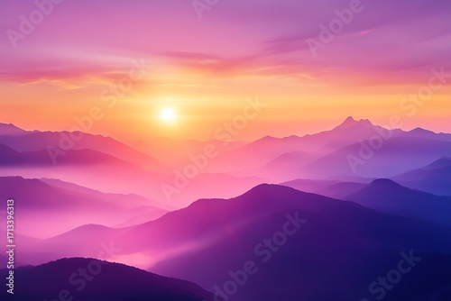 mountain, sunrise, landscape, hazy, peak, range, sky, nature, light, mist, evening, sunlight, cloud, panorama, travel, majestic, heaven, purple, orange, pink, layered, silhouette, bright, sun, hill, altitude, horizon, calm, scenic, violet, magenta, gradient
