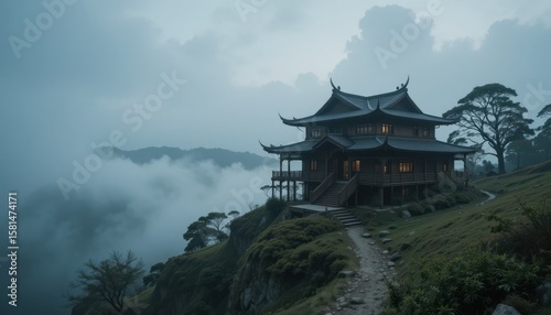 temple, mountain, fog, mist, asia, zen, serene, calm, peaceful, tranquil, spiritual, architecture, building, wooden, house, cloud, landscape, nature, scenery, view, hill, tree, path, cliff, grass, sky, twilight, evening, darkness, light, window, roof, pagoda, aesthetic, atmosphere, mystical, remote, solitude, haven, escape