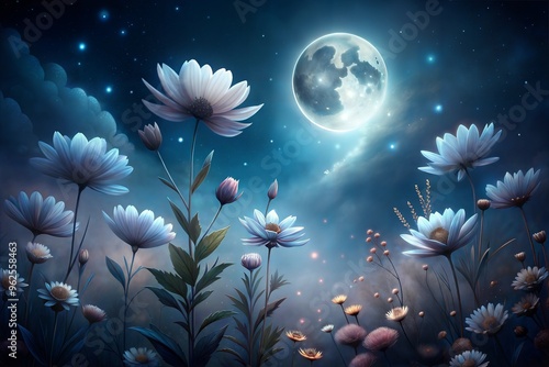 serene, night, landscape, full moon, wildflower, sky, star, calm, tranquil, nature, flower, bloom, meadow, cosmos, flora, atmosphere, dreamy, moody, peaceful, bright, glow, celestial, blossom, foliage, midnight, darkness, heavenly, moonlight, botanical, field, fantasy, aethereal, radiant, scenic, scene, white