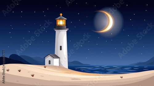 Serene Night Scene With Lighthouse, Moon, Ocean, And Gentle Waves Under Starry Sky