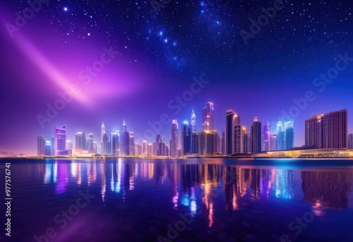 serene nightscape showcasing vibrant city skyline illuminated dazzling lights reflective water under starry sky, cityscape, urban, architecture, buildings