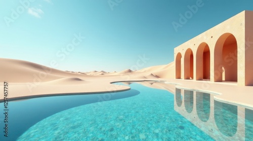 Serene Oasis Architectural marvel with arched alcoves reflects in a tranquil desert pool, creating a breathtaking landscape of sun-drenched sand and vibrant turquoise water.