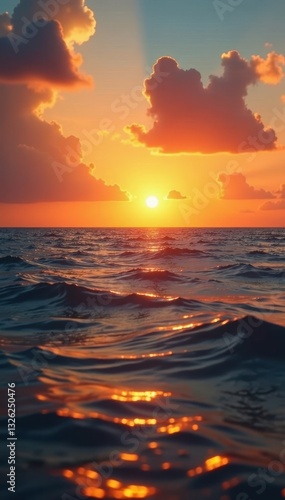 Serene ocean sunset, golden hues paint the sky, beach, clouds