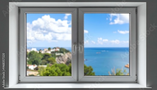 Serene ocean view from a white window. Perfect for travel, home, and relaxation themes.
