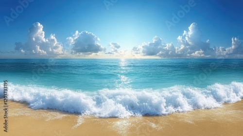 ocean, wave, copy space, sky, cloud, beach, serene, blue, sand, water, horizon, tranquil, nature, scenic, tropical, sunny, sea foam, daylight, shoreline, coast, peaceful, aquatic, picturesque, clear, fluffy, outdoors, coastal, travel, sandy, scenery, vibrant, foam, vacation, calm, natural, paradise, sunlight, idylli, escape, relaxation, inspiring, marin, summer, environment, get-away, beauty, landscape