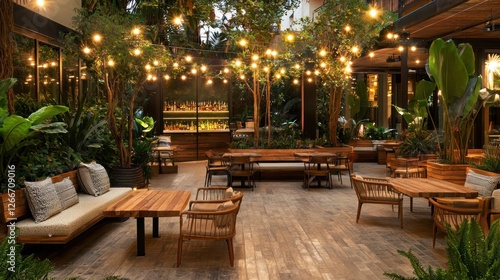 patio, eatery, garden, night, lighting, tree, furniture, seating, wood, tropical, plant, decor, ambience, relaxing, calm, serene, cosy, warm, illuminated, lush, green, bar, drink, evening, light, atmosphere, design, modern, stylish, elegant, wooden, table, chair, sofa, cushion, pillow, romantic, bright, dark