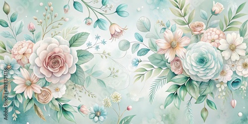 Serene Pastel Floral Arrangement Featuring Delicate Roses, Daisies, and Lush Greenery on a Soft Aqua Background