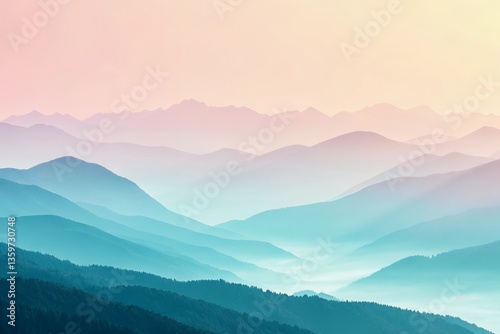 Serene pastel mountainscape at dawn, a breathtaking panorama of layered hills shrouded in gentle mist.