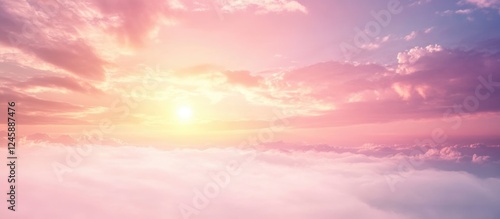 Serene pastel sunrise over a misty landscape with soft clouds and a vibrant sky creating a tranquil and dreamy atmosphere