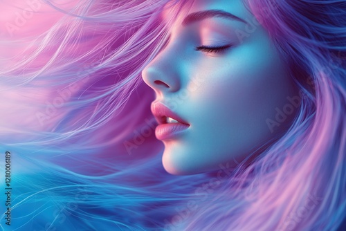 girl, woman, portrait, face, hair, pink, blue, flowing, wind, closed eyes, serene, calm, peaceful, beauty, beautiful, young, youth, model, style, fashion, cosmetic, make-up, lip, skin, youthful, dreamy, aethereal, artistic, creative, vibrant, colourful, fantasy, futuristic, neon, digital, ai, generated, profile, closeup, detail, glossy, elegant, graceful, attractive, sensual, gentle, romantic, aesthetic, artwork