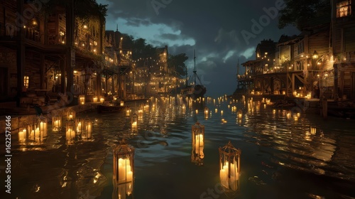 pirate, cove, dusk, lantern, glowing, water, evening, light, atmosphere, scene, harbor, tranquil, cosy, adventure, nature, shoreline, calm, colourful, illumination, mystery, festive, landscape, village, wooden, house, fishing, boat, glow, waterway, ambience, coastal, scenic, lantern, night time, enchantment, serene, beauty, illuminated