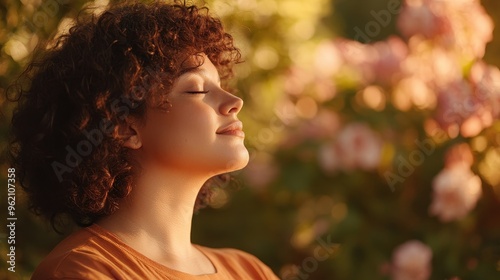 Serene Plus-Size Latina Woman Meditating in Lush Garden - Embracing Harmony of Body, Mind, and Nature Among Blooming Flowers (Close Up, Ethereal Silhouette)