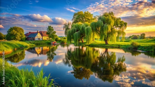 willow tree, countryside, nature, scenery, meadow, field, river, lake, water, sky, cloud, sun, light, green, summer, spring, autumn, tree, plant, rural, scenic, photo, image, picture, photo, background, wallpaper, travel, tour tourism, poland, europa, beautiful, serene, peaceful, calm, tranquil, picturesque, idylli, majestic, elegant, graceful, vibrant, colourful, environment, natural, ecology