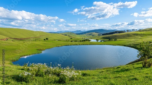 duck pond, lake, water, grass, field, hill, landscape, nature, rural, scenery, countryside, outdoors, summer, day, sunny, blue skies, cloud, green, vegetation, calm, peaceful, serene, tranquil, still, horizon, meadow, pasture, farmland, wildlife, environment, ecology, natural, beauty, scenic, view, panorama, travel, destination, photo, image, picture, photo, stock, royalty free, hi-res, vibrant, bright