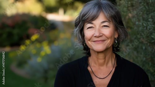 woman, portrait, nature, green, foliage, smiling, happy, serene, calm, relaxed, grey, hair, black, shirt, necklace, garden, sunlight, soft, light, natural, summer, spring, adult, female, person, human, face, expression, emotion, positive, pleasant, cheerful, content, older, middle, aged, mature, close, up, head shot, background, blurred, outdoors, environment, landscape, vegetation, plant, leaf