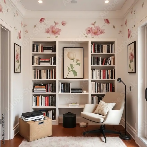 room, nook, reading, serene, calm, peaceful, quiet, library, bookshelf, book, shelf, floral, flower, rose, pink, white, decor, decoration, art, painting, picture, frame, artwork, chair, armchair, comfortable, cosy, relaxing, lamp, floor, light, rug, carpet, ottoman, storage, beige, brown, wood, wall, corner, elegant, stylish, home, house, interior, design
