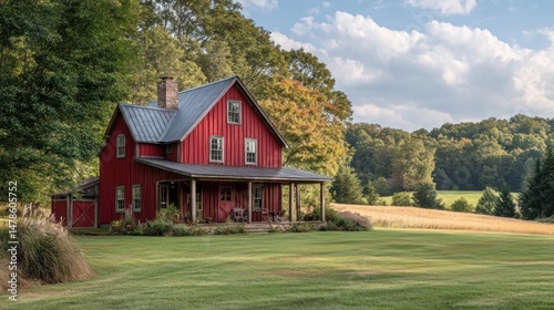 farmhouse, red, countryside, rural, house, home, landscape, building, property, architecture, nature, scenery, field, tree, grass, green, sky, cloud, summer, daytime, peaceful, tranquil, serene, calm, idylli, rustic, charming, beautiful, farm, barn, meadow, estate, residential, real estate, outdoors, country, farmland, exterior, photo, fisheye