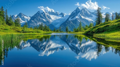 Serene Reflections: Majestic Snow-Capped Mountain Peaks Mirrored in Tranquil Alpine Lake