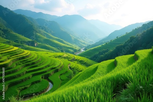 Serene rice paddies terraced along lush green hills in Eastern China, under a clear sky , beautiful, aerial view