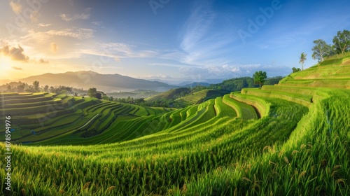 rice, terrace, sunrise, green, landscape, field, hill, farm, nature, sky, mountain, rural, agriculture, gold, light, morning, dawn, beauty, scenery, view, fresh, vibrant, tranquil, peaceful, serene, lush, tropical, asia, culture, tour tourism, travel, destination, photo, panorama, wide, horizon, cloud
