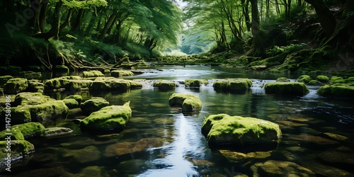Serene river flowing through lush green forest, moss-covered rocks in crystal clear water.