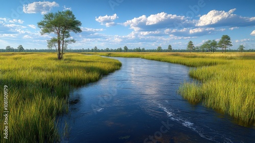 river, wetland, grass, tree, cloud, sky, nature, landscape, water, calmness, ecosystem, flora, fauna, environment, scenery, peaceful, sunlight, horizon, biodiversity, serenity, stream, marsh, wildlife, blue, green, summer, growth, natural, habitat, ripple, fresh, vibrant, panoramic, scenic, beauty, calm, rural, idylli, pristine, earth, sunshine, meandering, lush, clear, flowing