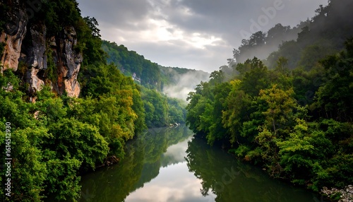 river, vale, fog, mist, forest, nature, water, tree, green, sky, landscape, stream, foliage, tranquil, timberland, cliff, serene, cloud, scenery, peaceful, wilderness, environment, vegetation, mountain, panorama, travel, tour tourism, outdoors, scenic, destination, summer, journey, background, season, natural, park, exploring, adventure, relaxation, vacation, geologic