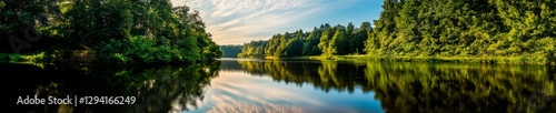 Serene river landscape reflects lush green forest and tranquil morning sky.