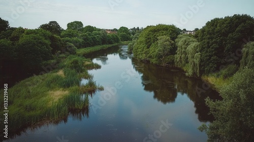 Serene River Landscape Tranquil Water Reflecting Lush Green Foliage