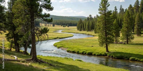 Serene river meandering through a lush green meadow, bordered by tall evergreen trees under a bright summer sky.
