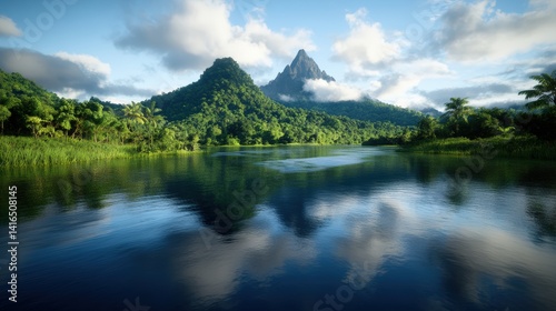 Serene river reflecting lush green mountains and soft clouds under the bright blue sky creating a tranquil and picturesque natural landscape scene