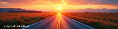 Serene road winding towards radiant morning sky, mountain, sunset, winter