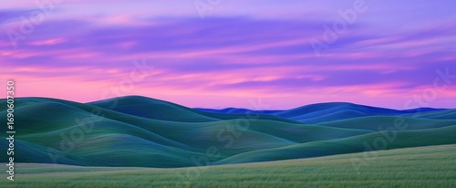 Serene Rolling Green Hills Under a Vibrant Purple and Pink Sunset Sky